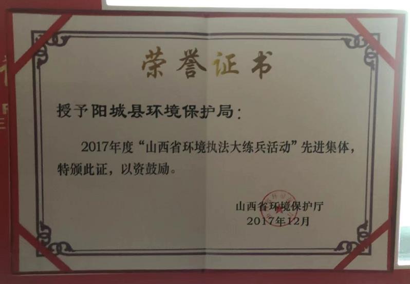 • 2017年被山西省生态环境厅表彰为“生态环境执法大练兵先进集体”