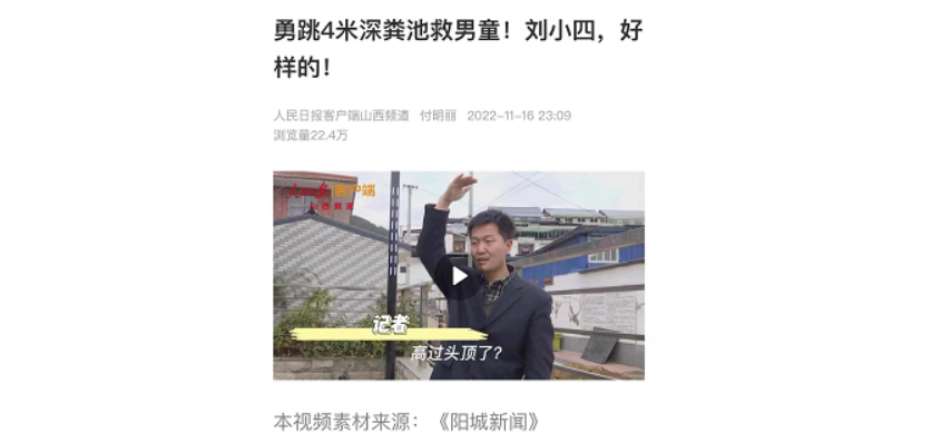 多亏有刘小四,要不是他出手相救,这个小孩就危险了!”11月12日,在山西晋城阳城县润城镇柏沟村,一名6岁男孩一脚踏空,跌入村头广场一角近4米高的化粪池中。