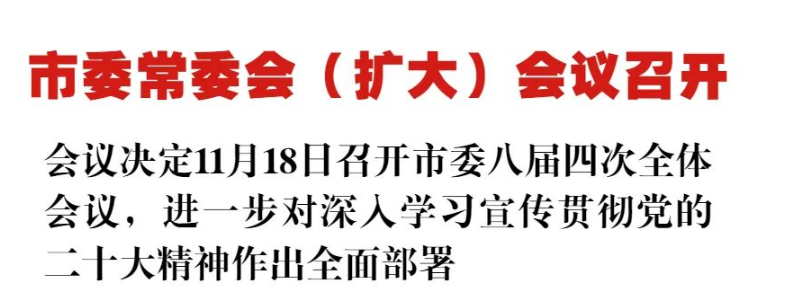 会议强调 即将召开的市委八届四次全会是在全市上下深入学习宣传贯彻党的二十大精神和省委十二届五次全会精神的关键时刻,召开的一次十分重要的会议。全市上下要更加自觉地把思想和行动统一到党中央和省委、市委的各项决策部署上来,进一步加强统筹协调、强化沟通配合,扎实做好各环节工作,确保全会圆满成功。