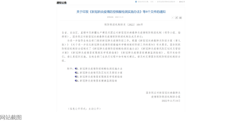 为进一步指导各地各部门做好新冠肺炎疫情防控工作,根据《新型冠状病毒肺炎防控方案(第九版)》《关于进一步优化新冠肺炎疫情防控措施科学精准做好防控工作的通知》有关要求,国务院联防联控机制综合组制定了《新冠肺炎疫情防控核酸检测实施办法》《新冠肺炎疫情风险区划定及管控方案》《新冠肺炎疫情居家隔离医学观察指南》《新冠肺炎疫情居家健康监测指南》。现印发给你们,请认真组织实施。各地各部门在执行过程中如有相关建议,请及时反馈国务院联防联控机制综合组。