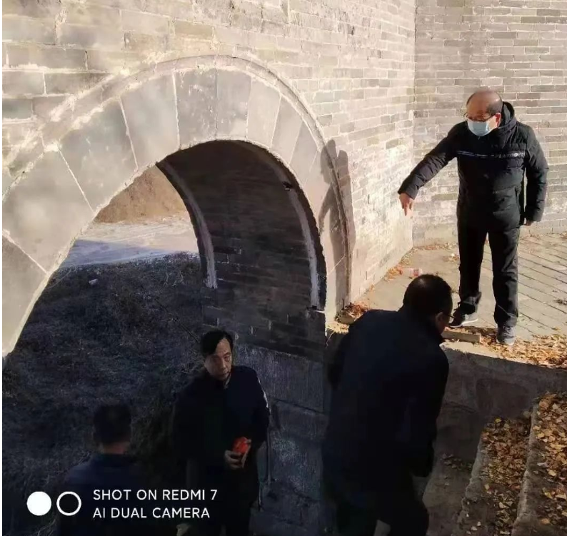 12月10日,晋城市中共党史学会一行6人到水西村“太行善庄文化庄园”参观学习时,偶然对位于关帝庙左前方东城墙的拱门出口产生好奇,从拱门拾阶而下可直达丹河河道,感觉其奇特的建筑形制和超乎寻常的尺寸以及不合常理的方位大有玄机。拱门为砖石结构的明清建筑,宽2.45米,高2.96米,墙厚0.95米。拱门内侧上方镶嵌“礼门义路”四字石匾额,外侧上方镶嵌“环丹山庄”字样石匾额。更为奇特的是拱门一半在庄园地面水平之上,一半在地面水平之下,门脚处一米纵宽的歇脚平台将19级青石台阶分为两节,上拾7级进入拱门到达庄园地面,下拾12级直达丹河河床。从里向外眺望,丹河湾宽阔空旷,一览无余。下至河床回首仰视,寨墙高筑,南北延绵,转折有致。在由巨石垒砌一丈有余的护墙上,拱门南边十多米是庄园的最高建筑“文昌阁”,北边十多米是居高临下的观景台,其间由带有垛口的砖砌城墙将三处景观有机地联接为一个优美壮观的建筑整体。其高大与厚重压迫感十足。