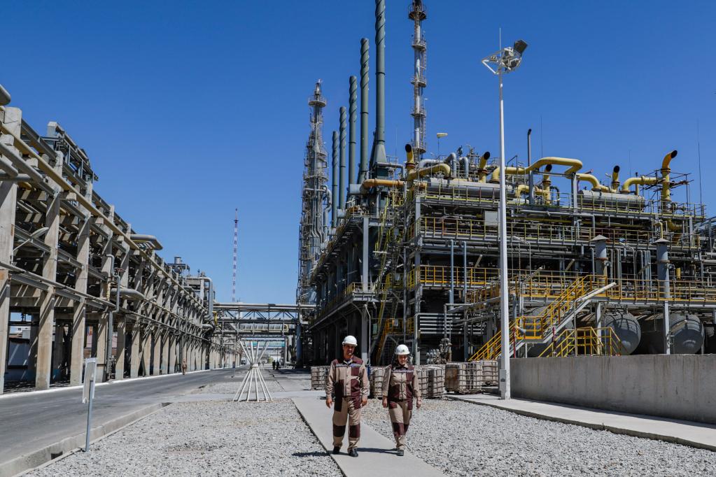 这是去年8月18日在乌兹别克斯坦纳沃伊市拍摄的纳沃伊氮肥股份公司聚氯乙烯工厂