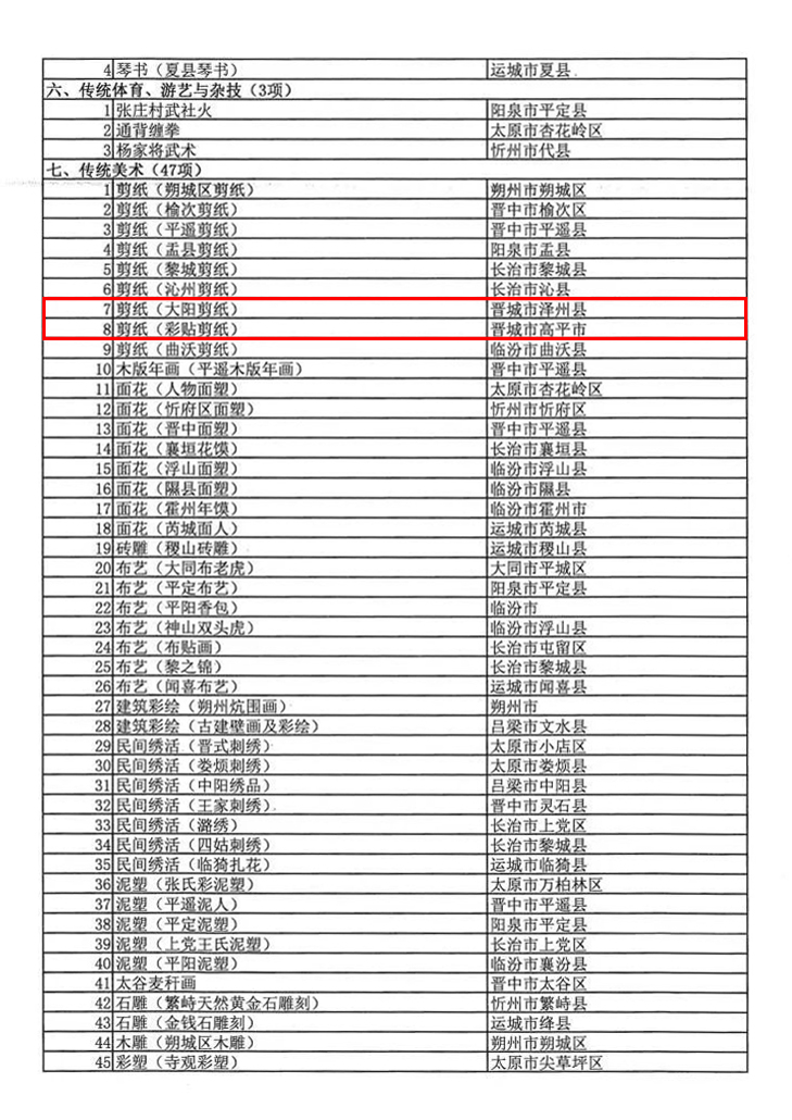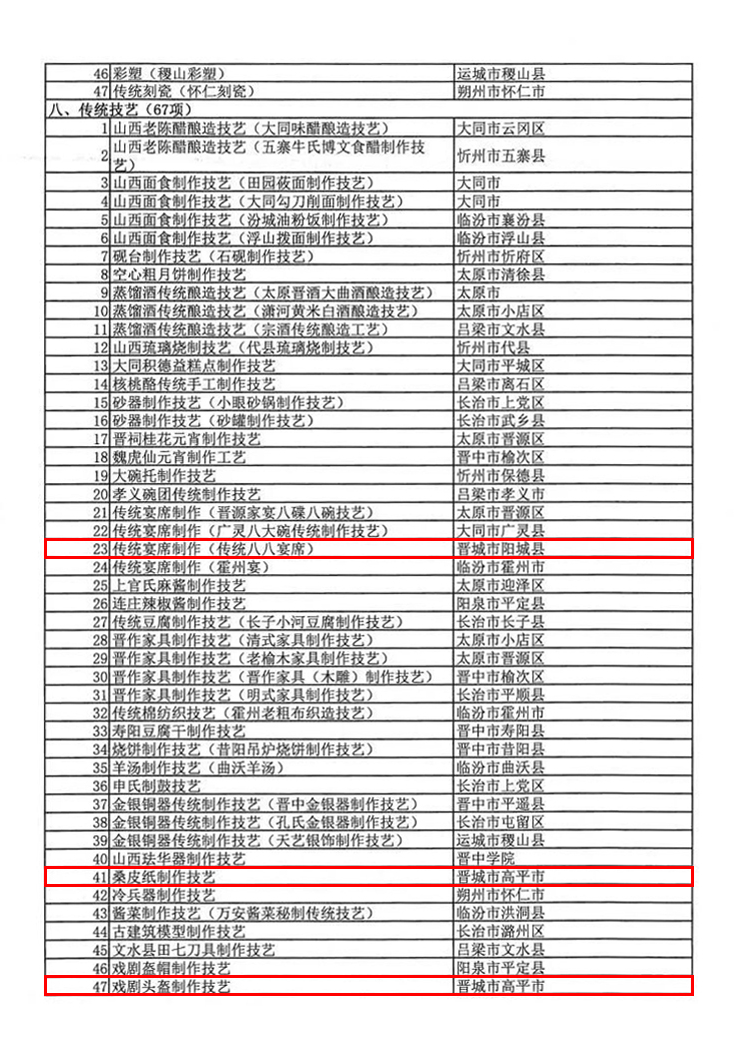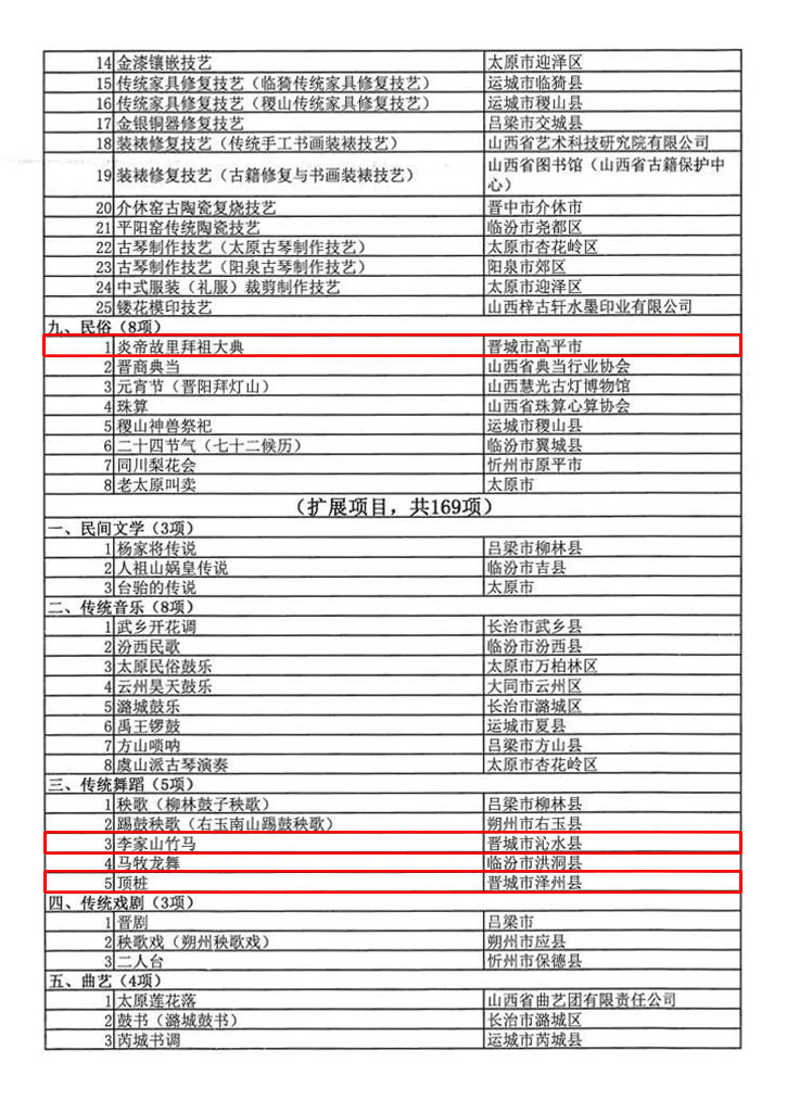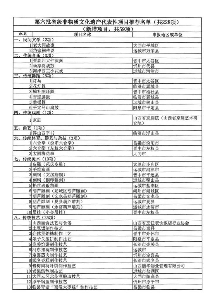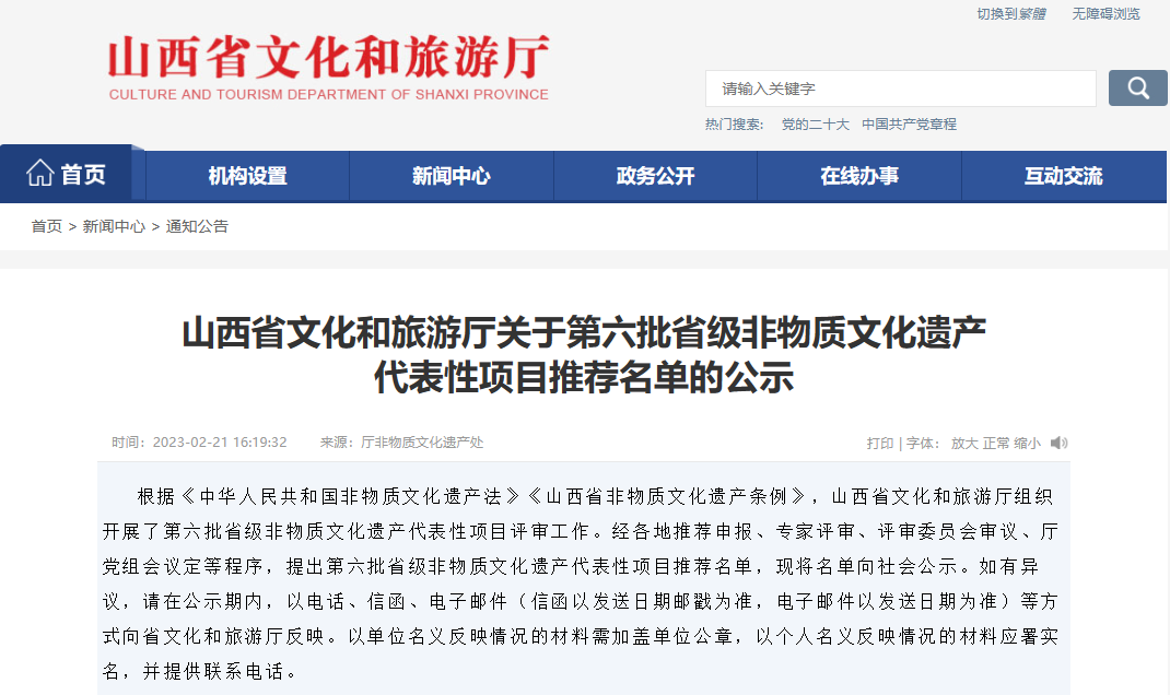 根据《中华人民共和国非物质文化遗产法》《山西省非物质文化遗产条例》,山西省文化和旅游厅组织开展了第六批省级非物质文化遗产代表性项目评审工作。经各地推荐申报、专家评审、评审委员会审议、厅党组会议定等程序,提出第六批省级非物质文化遗产代表性项目推荐名单,并将名单向社会公示。
